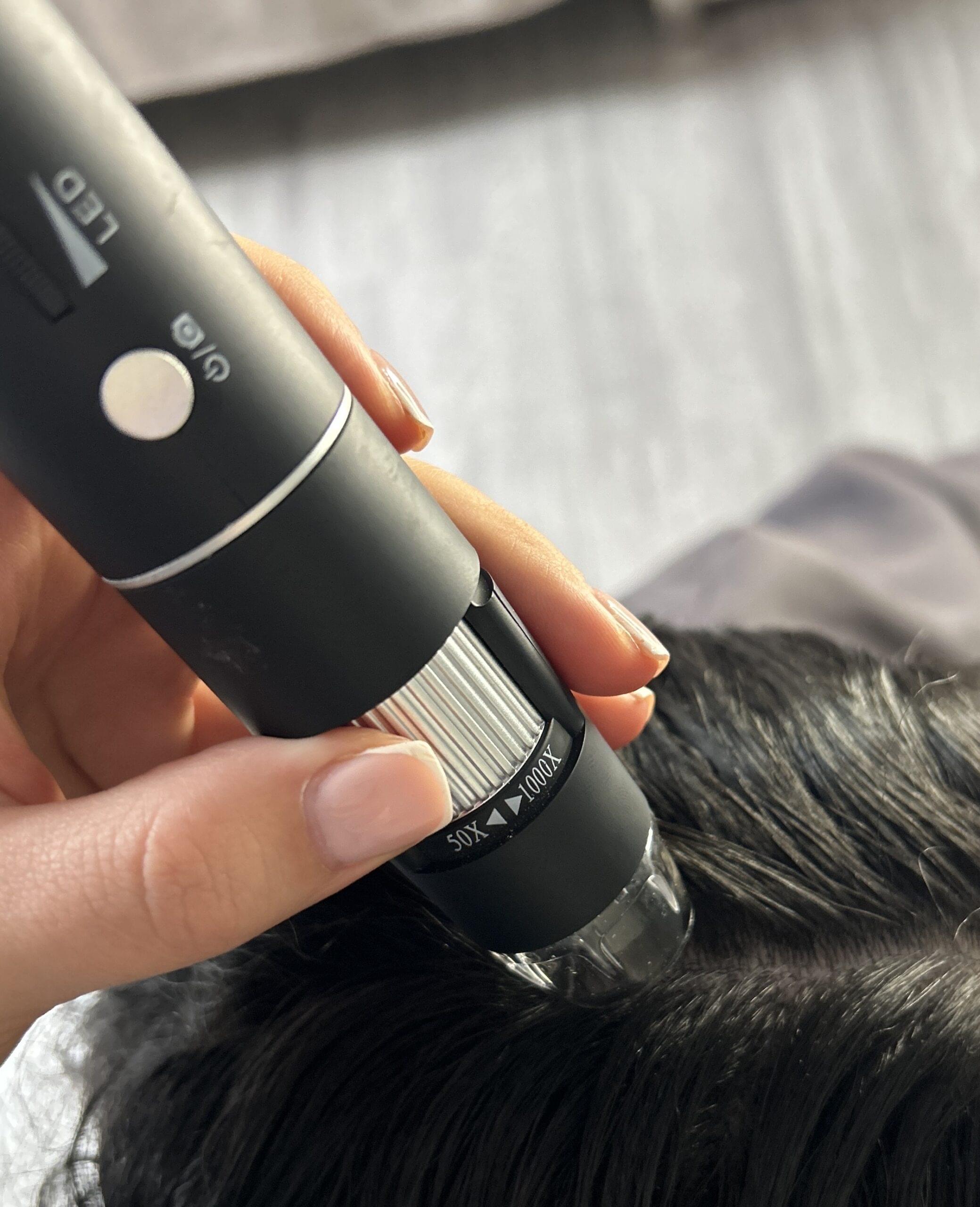 Met behulp van de mediscope maken we een nauwkeurige scan van de hoofdhuid, waardoor we mogelijke problemen zoals schilfers, eczeem en/of psoriasis kunnen identificeren. We kunnen ook de talgproductie, de conditie van de haarzakjes en eventuele droogheid waarnemen. Op basis hiervan kan ik een gepersonaliseerd behandelplan opstellen om de conditie van het haar en de hoofdhuid te verbeteren.